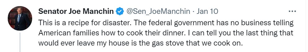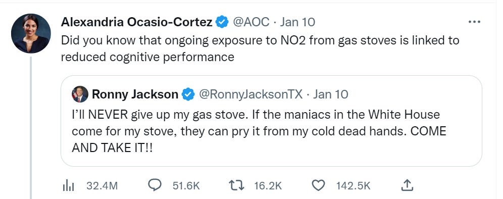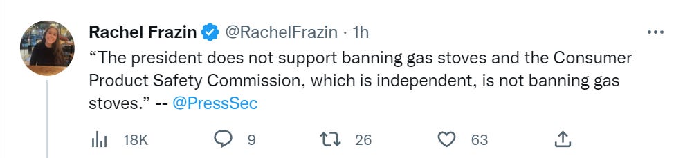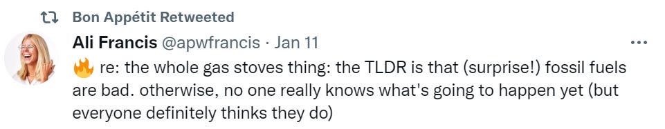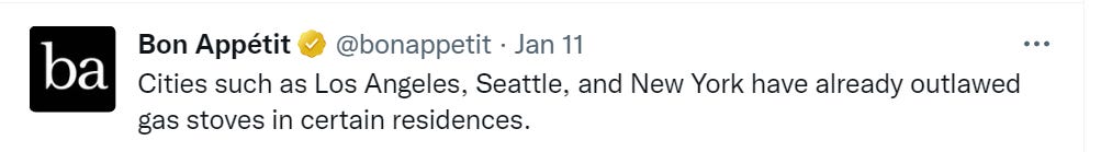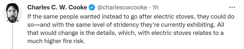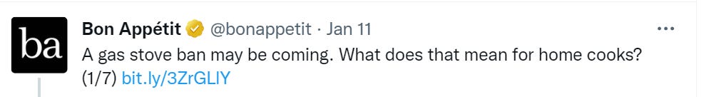 I get that it’s a positional move in the climate change war to get rid of an obstacle to eliminating gas consumption, but it seems like a 2012 kind of play… it just seems so small and banal for 2023. “We’ll ban church attendance, declare that only the businesses we’ve invested in can stay open, steal a U.S. presidential election and use a military coup to install our new puppet, debank the family members of anyone who contributed to protesters’ nonprofits, take over farmland and try to end meat production, genocide Russians in the Donbass to force Russia into a war in which we’ll try to destroy their country… oh yes and we’ll also make everyone use very, very slightly less convenient cooking appliances.”