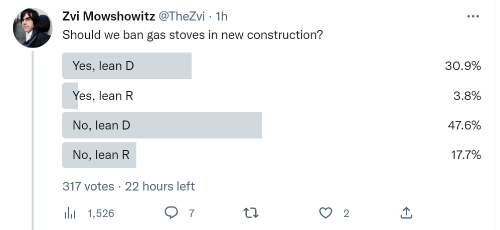 Even among my Twitter followers, quite a few want to ban gas stoves, with a strong partisan effect.