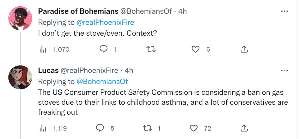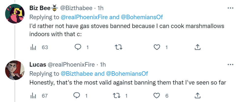 The replies, of course, include a number of people supporting banning gas stoves.