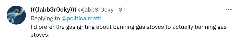 I would not underestimate the political impact of such efforts. It sticks with you. It is striking how many people on Twitter are saying ‘gas stoves for life.’ Scott Sumner idly wonders (in what is otherwise a post about life expectancy) if those considering a ban ‘are working for Trump’ and speculates a ban would shift Asian Americans to the GOP.