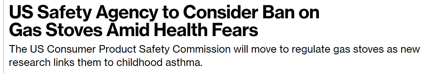 My personal, completely unsubstantiated theory, is that government wants to ban gas stoves for two reasons: 1: they need to build a lot of gas peaker plants to support photovoltaics, so forcing us to reduce demand saves them money. And 2: they’ve let cost disease get out of hand and don’t want to be responsible for maintaining gas infrastructure to homes anymore.