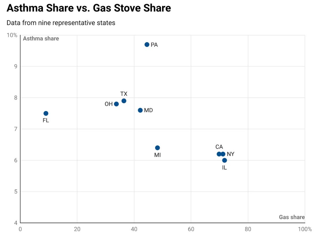I am confident gas stoves do not prevent asthma because physics. One still notes that if this graph had been reversed it would be part of the case to ban such stoves.